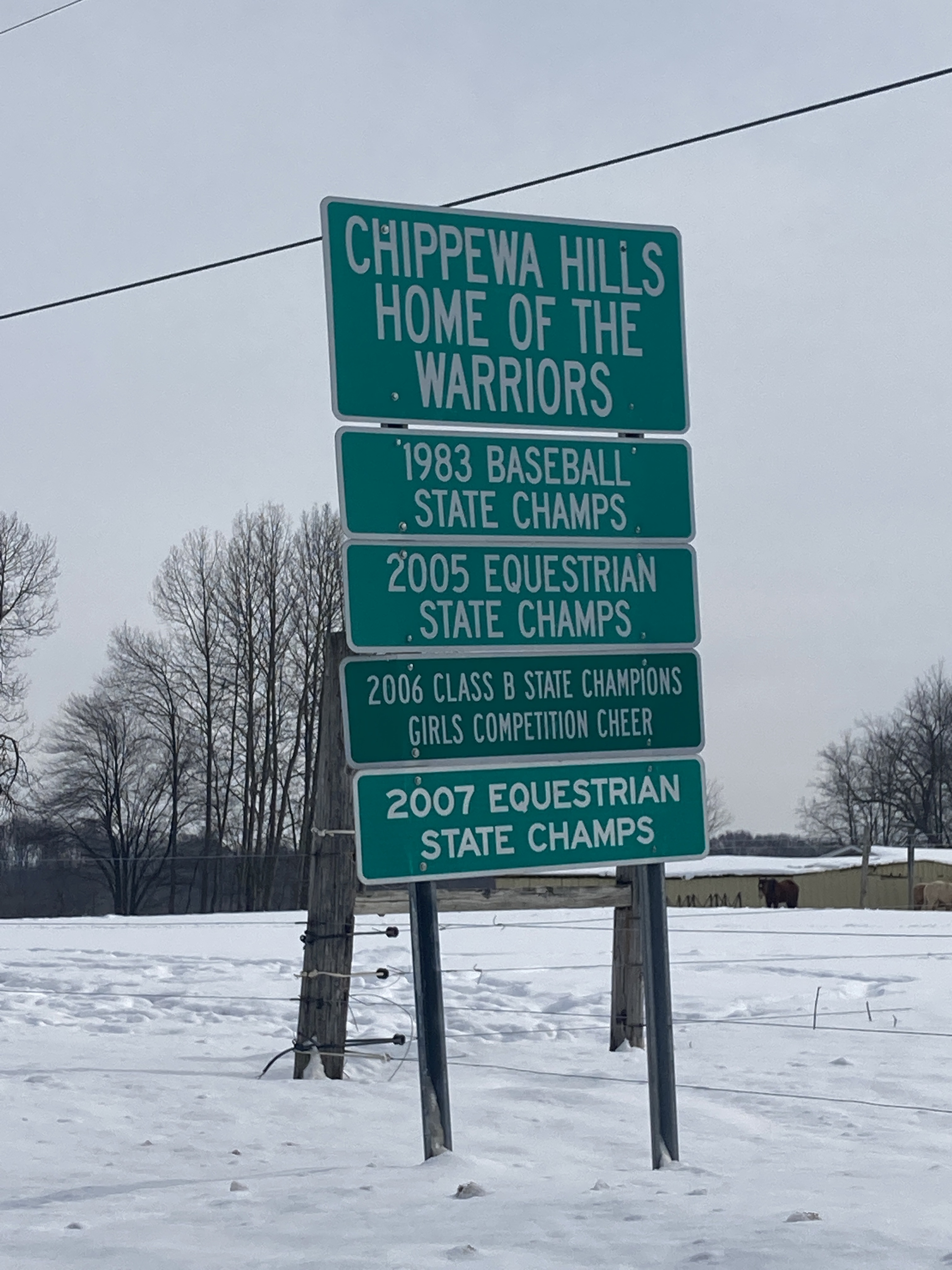 Chippewa Hills schools are based in Remus. The MHSAA web site calls them Remus Chippewa Hills. But there was no sign in Remus.