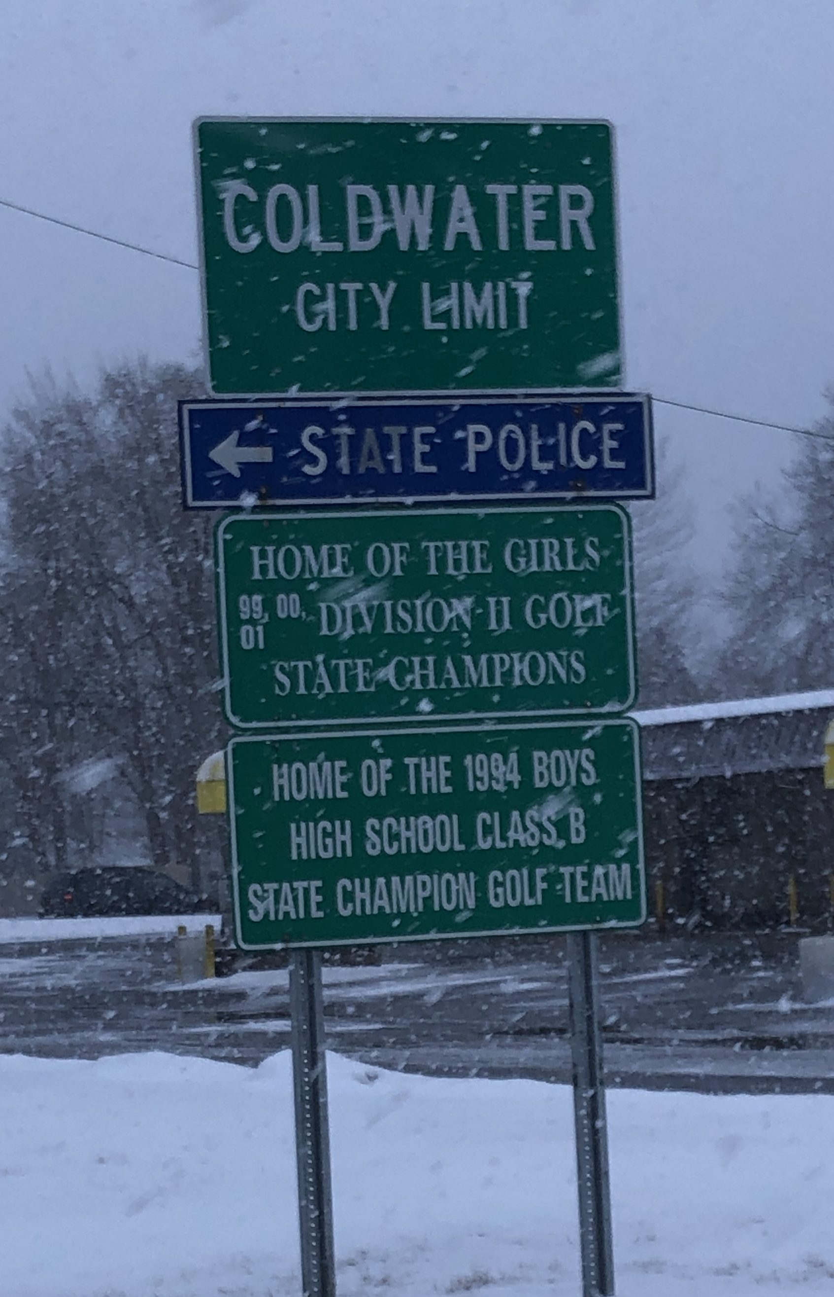 I find it oddly satisfying that the Coldwater sign was taken while it was snowing and you can even see the flakes.