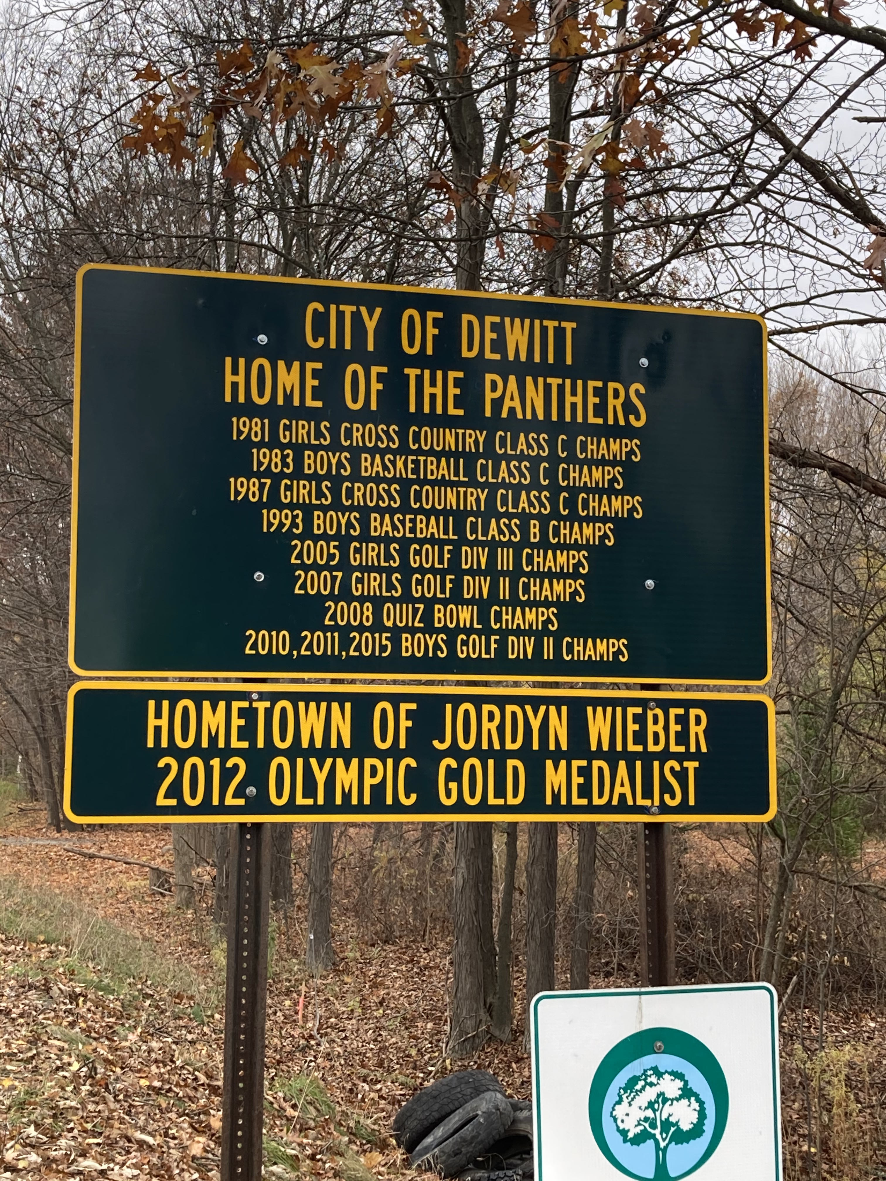 You have the obligatory “Home Of” sign. Then there’s the school, the mascot, a boatload of state champions, a “Hometown Of” sign, with a gold medal winning Olympian.